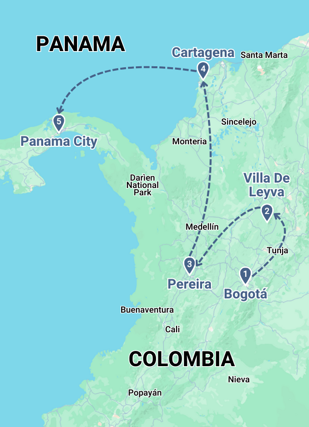 • Cities: Bogota, Zipaquira, Villa De Leyva, Pereira, Cartagena, Panama